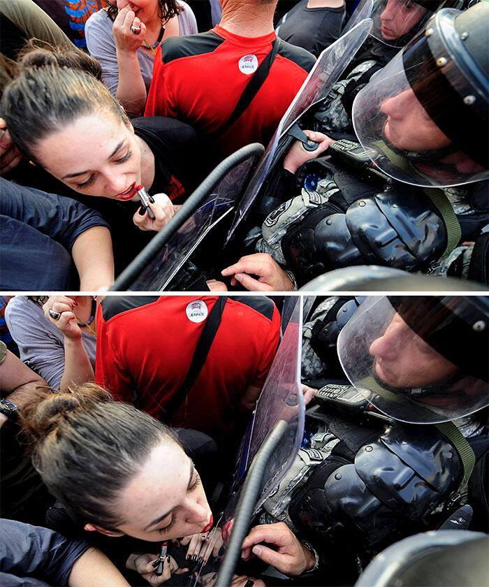 Un clima tesissimo che ha fatto risaltare, in una stridente armonia la calma e la sicurezza della ragazza, ripresa nella foto, che ha utilizzato lo scudo del poliziotto come specchio per compiere un’azione tanto normale e superflua in un clima di tensione, come mettersi il rossetto.