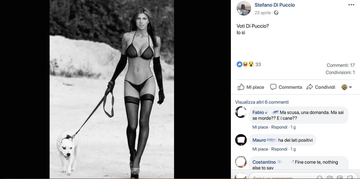 Questa volta, purtroppo, dobbiamo parlare di un politico, Stefano Di Puccio, consigliere comunale del PD nuovamente candidato. Il 23 aprile ha pubblicato nel suo profilo Facebook l’immagine di una ragazza seminuda, in reggiseno, perizoma, calze autoreggenti e tacchi vertiginosi, mentre porta a spasso il cane, accompagnata dalla frase: “Voti Di Puccio? Io sì”, con l’intento di farsi pubblicità elettorale.