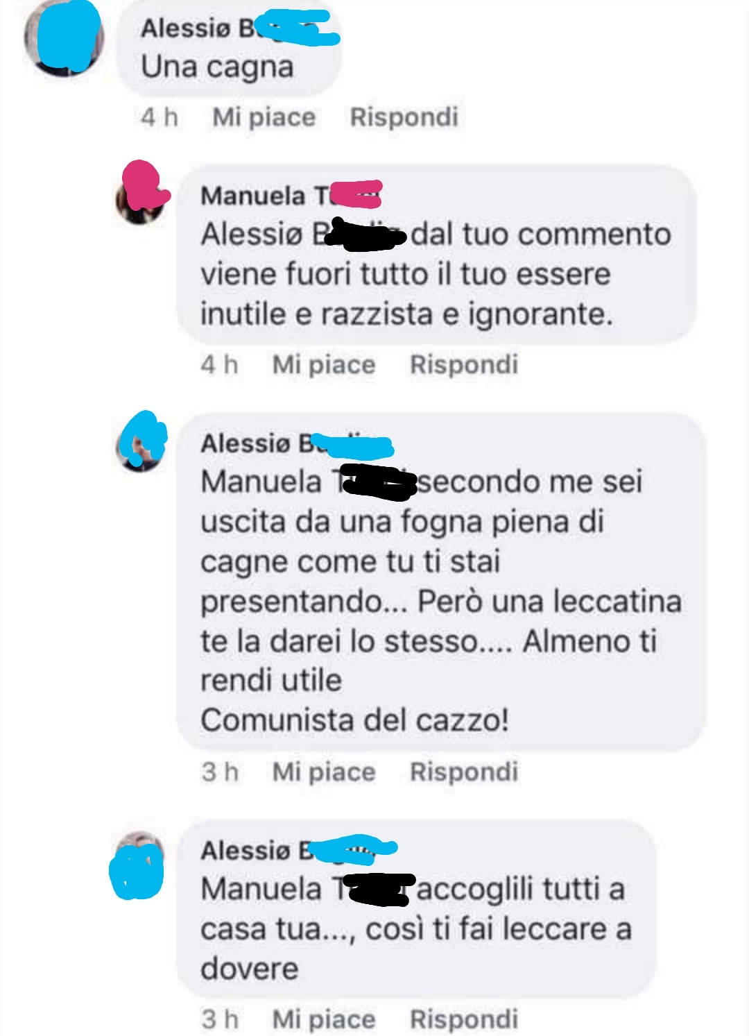 “È cagna” proseguendo poi a insultare anche la donna che l’aveva difesa e dicendo pubblicamente che l’avrebbe “leccata”, così almeno si sarebbe resa “utile” e consigliandole di accogliere tutti i migranti a casa sua, così l’avrebbero “leccata” anche loro.