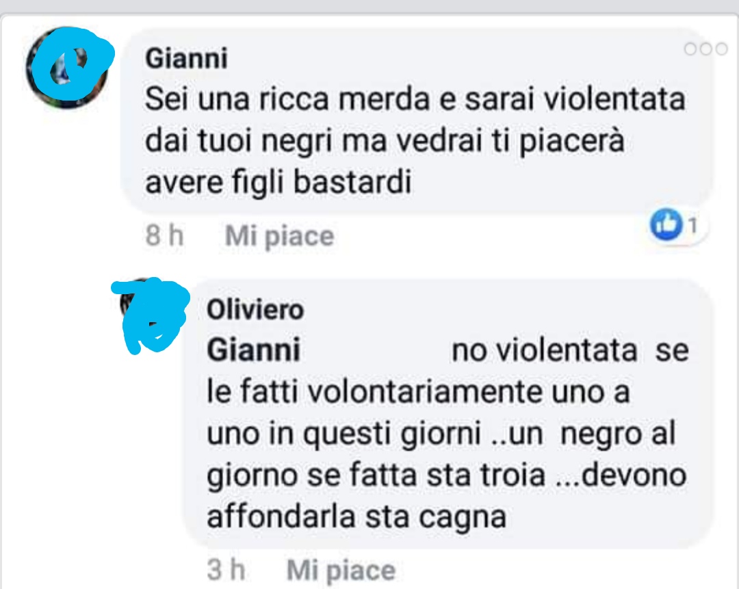 Rilanciato da: “NO VIOLENTATA SE LE (li è*, ndr) FATTI VOLONTARIAMENTE UNO A UNO IN QUESTI GIORNI… UN NEG** AL GIORNO SI È FATTA STA TRO**… DEVONO AFFONDARLA STA CAGNA”