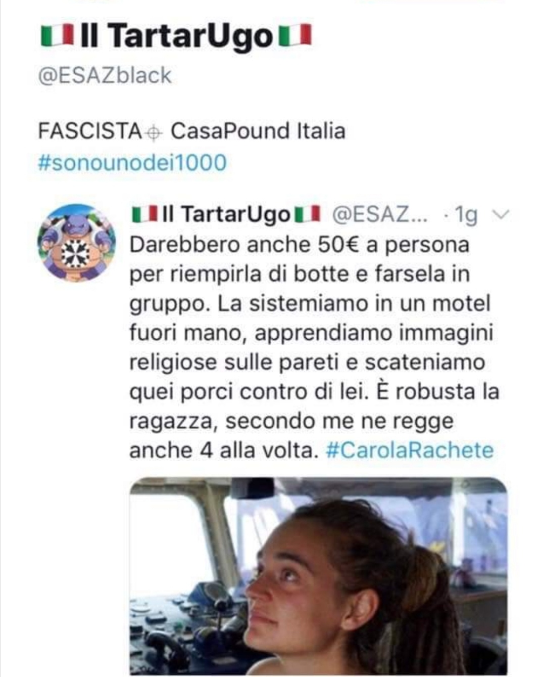 Uomini che le augurano lo stupro, in continuazione. Glielo urlano in un video mentre lei scende dalla nave, lo scrivono come appello su Twitter, lo scrivono nei commenti di Facebook.