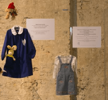Tra i vestiti esposti, si vedono anche il grembiule di scuola elementare di una bambina e un abitino ancora più piccolo.
