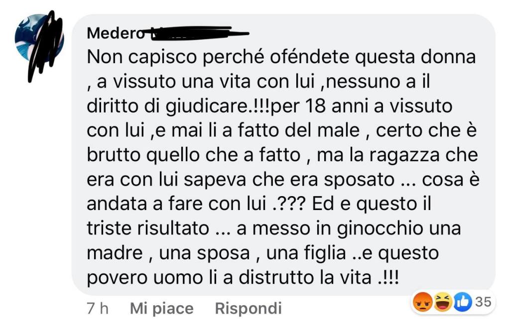 “…Ma questa ragazza non sapeva che era sposato?? … Ed è questo il triste risultato: ha messo in ginocchio una madre, una sposa e una figlia… ha distrutto la vita a questo povero uomo” sostiene Medero “…Lui è sempre un uomo, è nella sua natura fare queste proposte, tocca a noi donne dire di NO! …Se l’è cercata!”