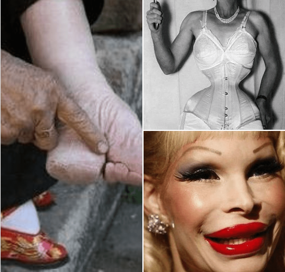 Vediamo nella storia delle aberrazioni come il Loto d’Oro, i piedi fasciati delle donne cinesi che li deformavano completamente, rendendole incapaci di muoversi normalmente.