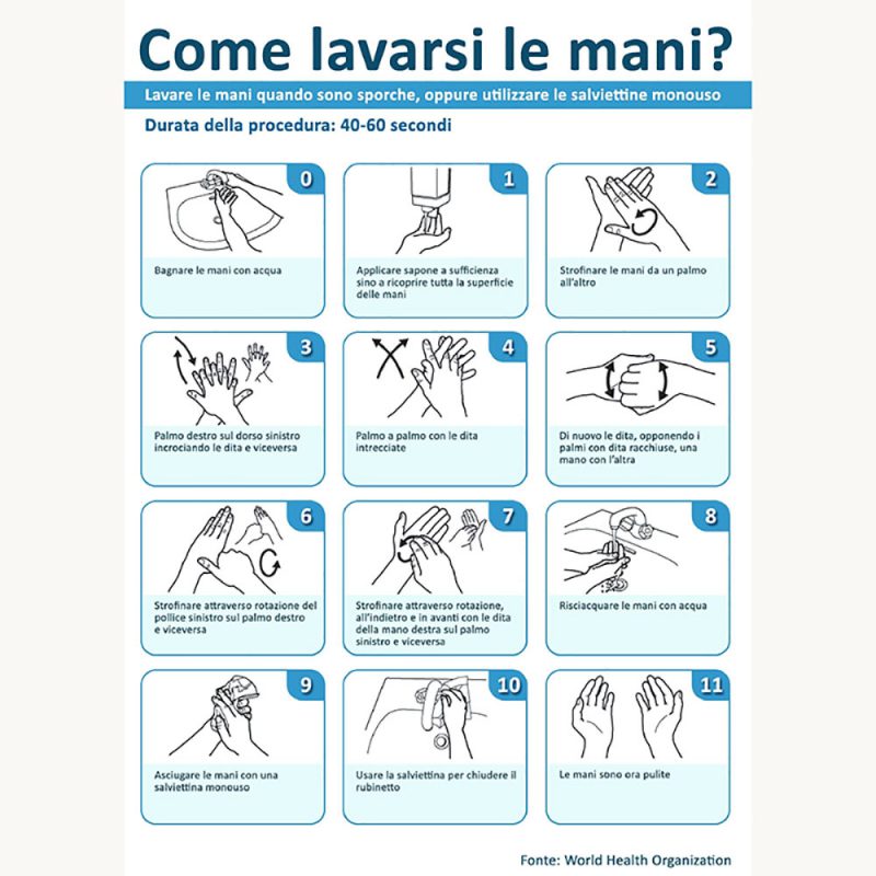Il lavaggio delle mani con acqua e sapone per almeno 40/60 secondi (se volete sapere come farlo adeguatamente sotto c’è la foto con le indicazioni dell’OMS), vi garantisce una perfetta igiene. Se volete usare i gel per le mani usate quelli con una percentuale di alcol pari ad almeno il 60% e potete prendere anche quelli preparati da alcune farmacie come prodotti galenici provvisti di apposita etichetta.