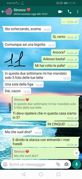“Non puoi succhi@rmelo… Posso almeno pretendere di vedere un po’ della tua f*g@ e delle tue ttte? …Per potermici smanettare e sb*rr@re sopra… Che sarà mai? …Non ci vedo nulla di male, piuttosto di male ci vedo che non mi hai mandato nulla.” Scrive lui.