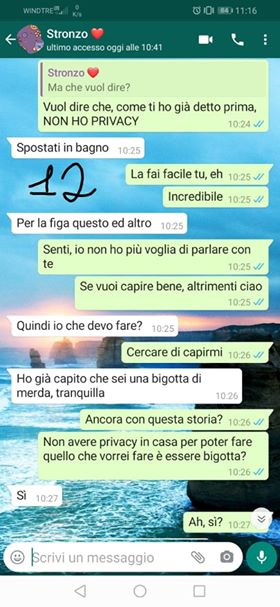 Lui ribatte: “Embé? …Dovresti essere contenta… E invece sei una bigotta di m#erd@… Io che faccio? Ho bisogno di seg@rmi, sono un uomo. Mica come te che sei donna e non hai istinti.”