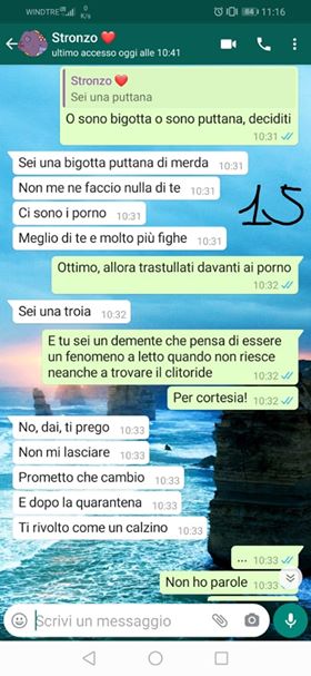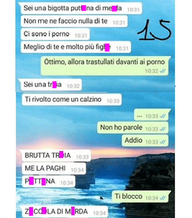 “Sei una p#tt@n@… Sei una bigotta p#tt@n@ di m#rd@. Ci sono i porno, meglio di te e sono più f*gh#. Sei una tr*i@… BRUTTA TR*I@. ME LA PAGHI, P#TT@N@. ZCC*L@ DI M#RD@”.