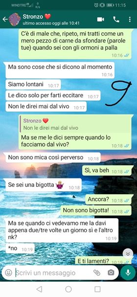 E lui: “Che è quello che devi fare, infatti… Devi soddisfare i miei bisogni sessuali. Sei la mia ragazza. Devi farlo altrimenti io esco e vado a trovarmene un’altra. Se metto ‘in cerca di una f#g@’ nell’autocertificazione stai certa che mi lasciano passare.”