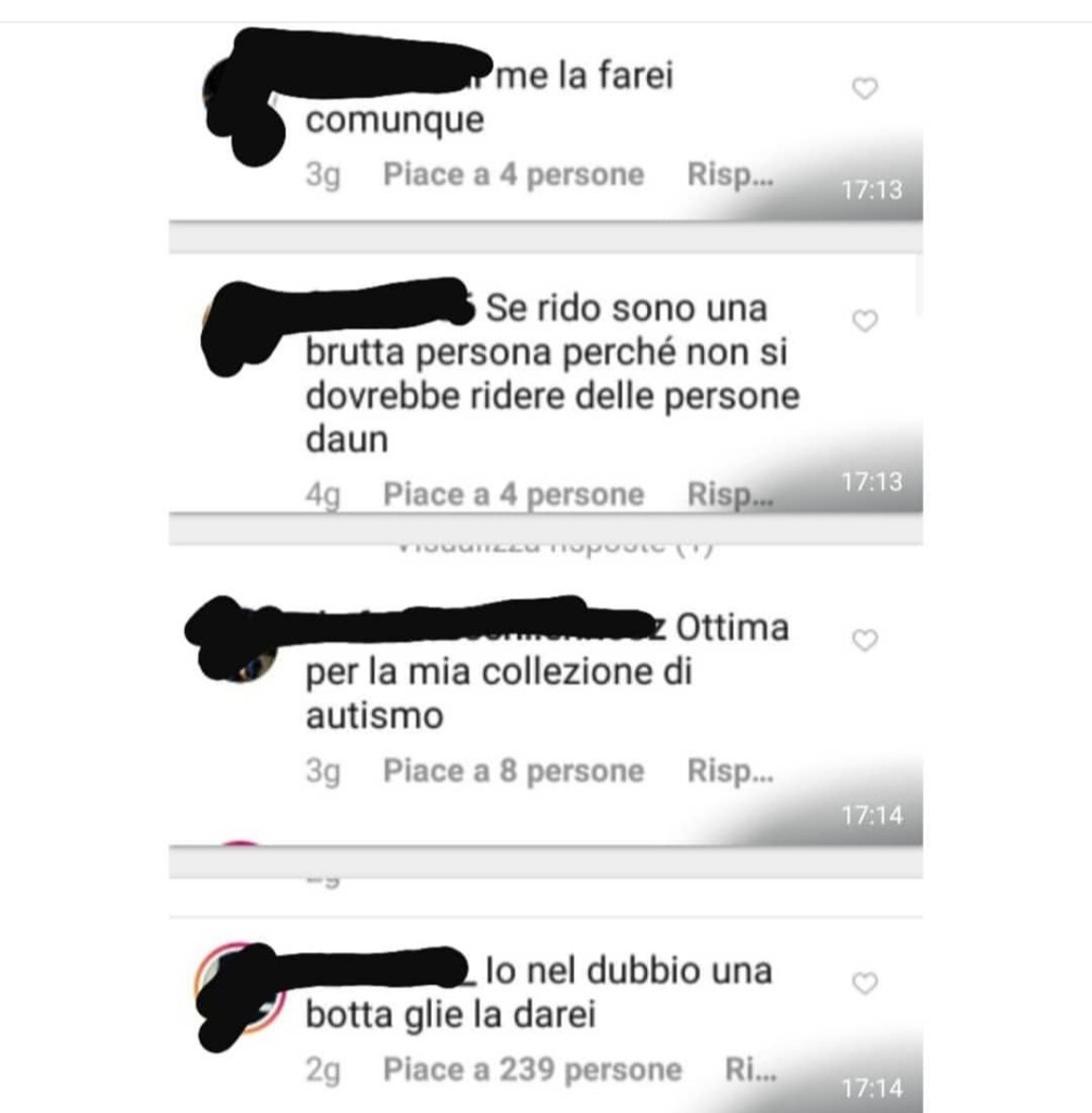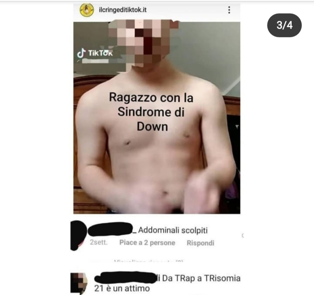Qualche giorno fa abbiamo segnalato attraverso il nostro profilo Instagram (@Ihaveavoice_official) un account chiamato “11enni in calore” con più di 30.000 followers, dove pubblicavano video presi da TikTok di ragazzini minorenni di 11/13 anni, senza il loro consenso, con l’effetto di derisione e, per qualche pervertito, di “eccitamento”. I commenti sotto quei video, infatti, sono abbastanza espliciti: “me la farei”, “una botta gliela darei”, ecc. In un altro account sempre a loro collegato, si derideva anche una persona con Sindrome di Down.