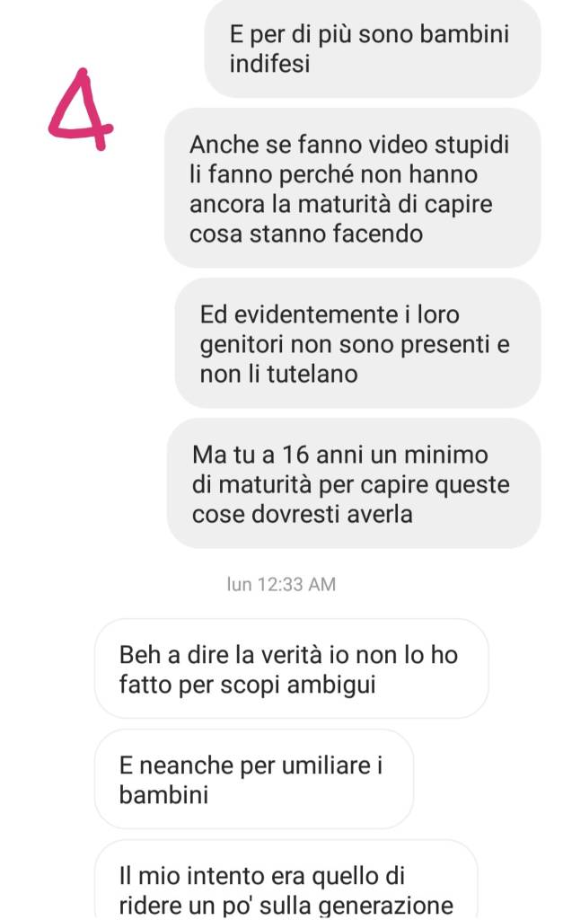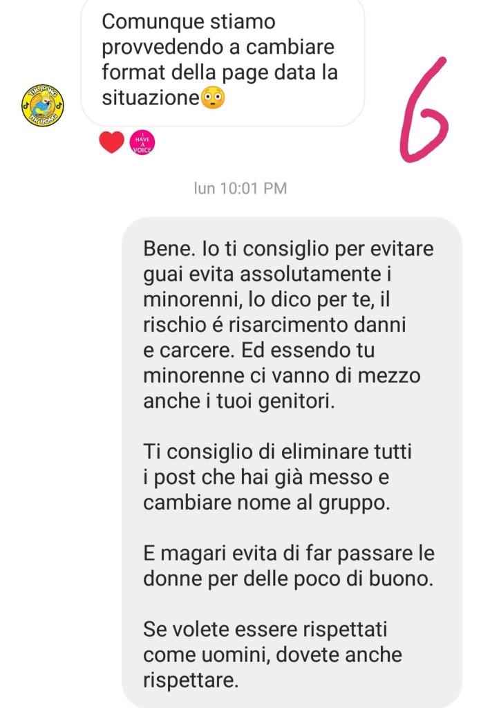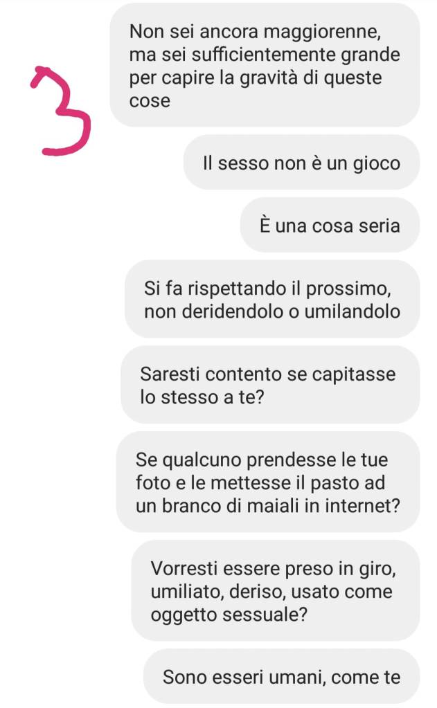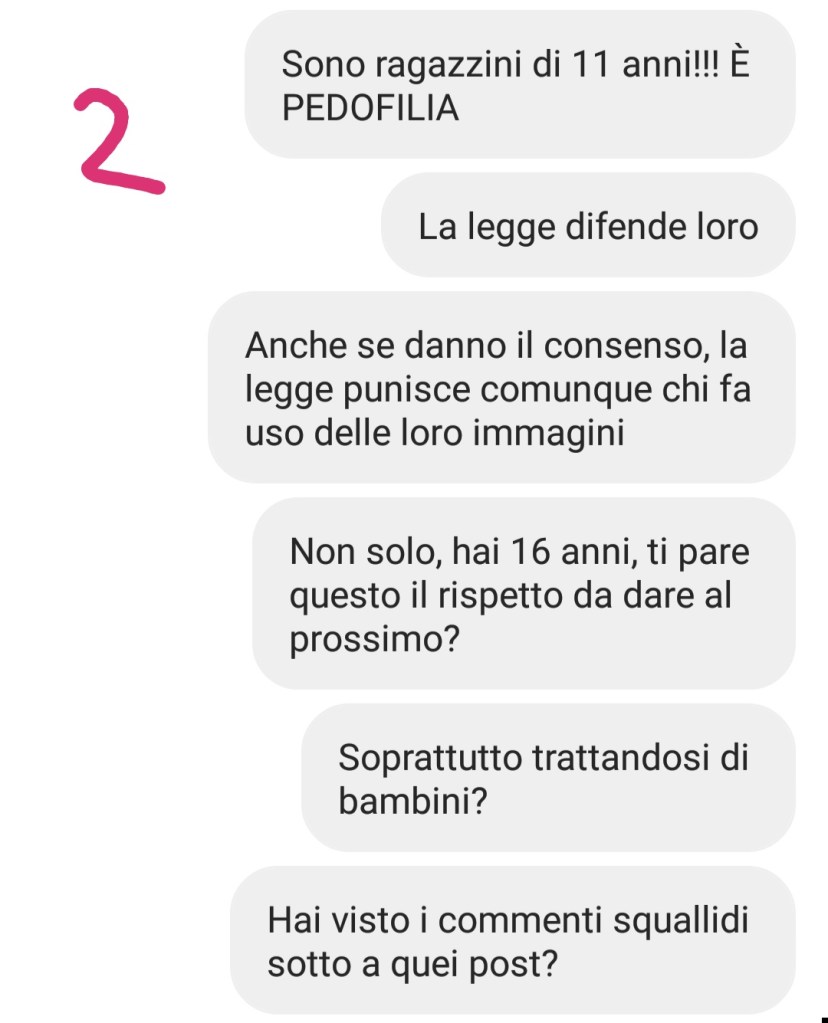 Dopo il nostro post dove chiedevamo ai nostri followers di segnalare il loro account per farlo chiudere, gli amministratori (degli adolescenti) ci hanno scritto in privato, chiedendoci di poter parlare di questa faccenda. Abbiamo spiegato loro quanto fosse sbagliato fare una cosa del genere, non solo perché deridere le persone è una forma di bullismo, ma soprattutto perché se la stavano prendendo con dei bambini, che sono troppo giovani per difendersi e, ancor più, perché attiravano i pedofili permettendo loro di fare quelle squallide battute.